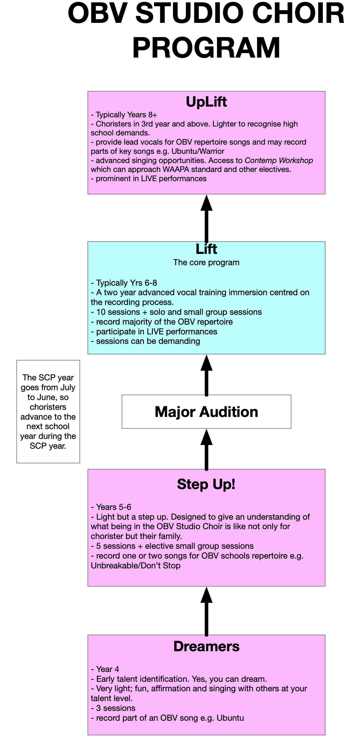 • The program also includes a range of free elective offerings. These include small ensemble recording sessions as well as song workshop sessions in which choristers participate in the development of original songs and arrangements for the OBV repertoire. Live performance engagements may occur at any time.